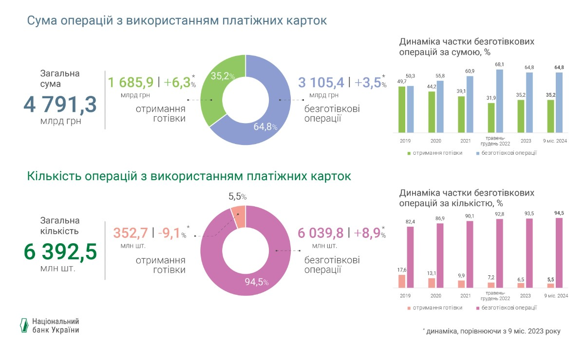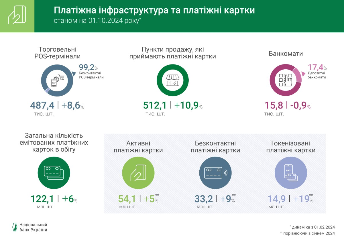 До речі, щодо безконтактних платежів. Станом на вересень 2024 року українські банки обслуговували 54,1 млн активних карток. Тобто таких, за якими впродовж останнього місяця була проведена бодай одна операція. Це на 5% більше, ніж на початку року. І важливо, що з цих мільйонів карток 33,2 млн були обладнані чипом безконтактної оплати.