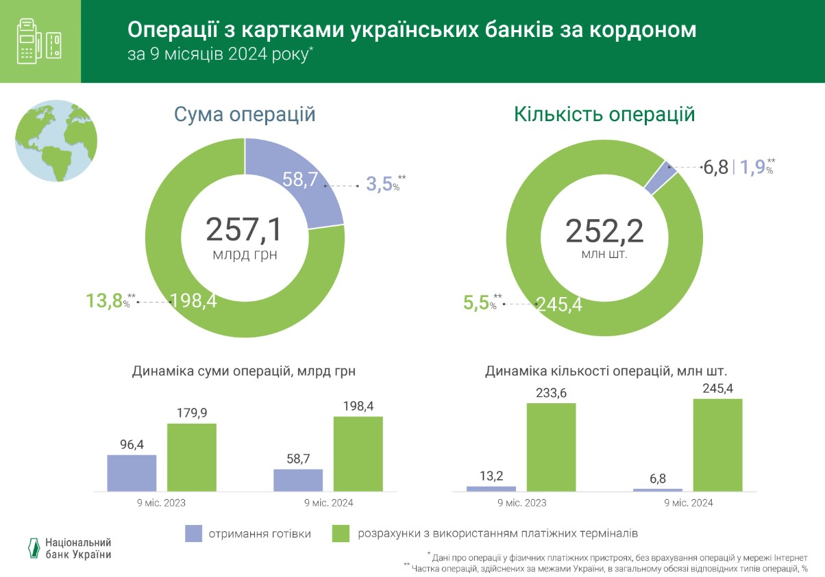 При цьому ж, хоч і не так динамічно, зростали розрахунки картками українських банків у магазинах: їх сума за рік збільшилася 179,9 млрд грн до 198,4 млрд грн. Не так жваво, насамперед через послаблення гривні, зростала кількість операцій. У перші 9 місяців минулого року українці за кордоном (йдеться саме про розрахунки у фізичних терміналах, очищені від покупок онлайн) зробили 233,6 млн покупок. Цього року – 245,4 млн аналогічних операцій.