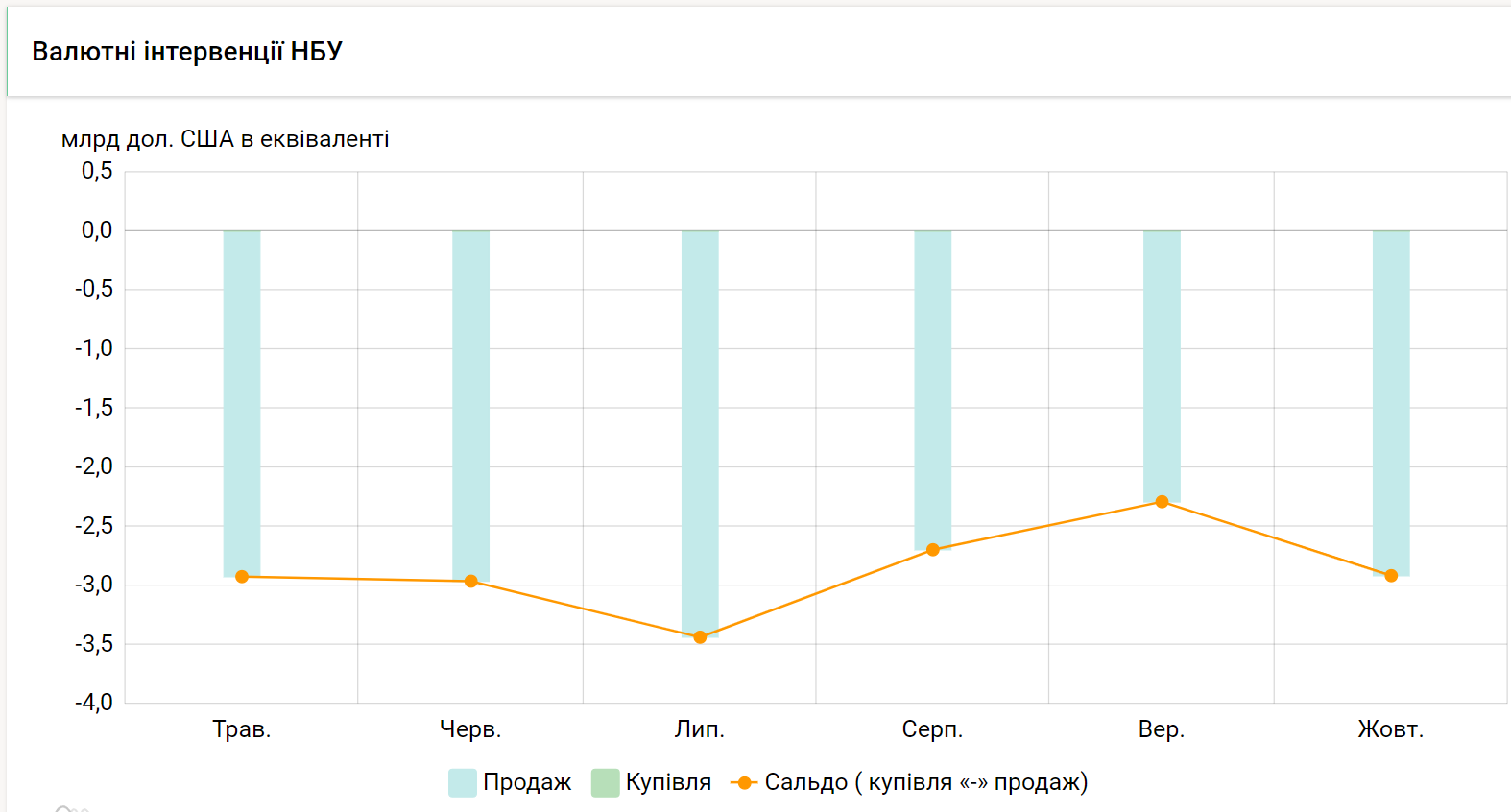 За даними НБУ, з початку року регулятор здійснив валютних продажів на рівні кількох десятків мільярдів доларів (приблизно $38–40 млрд) і купував мінімальні обсяги (десятки мільйонів). У жовтні НБУ наростив інтервенції ще активніше: чистий продаж іноземної валюти склав $2,915 млрд — це на 27% більше, ніж у вересні. Загалом жовтневі продажі виявилися досить високими в межах поточного року, проте не найвищими. Наприклад, обсяг валютних інтервенцій НБУ у травні складав $2,92 млрд, у червні — $2,961 млрд, липні — $3,436 млрд/