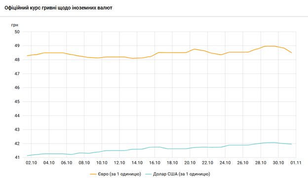 У жовтні гривня дещо ослабла — від офіційного курсу 41,1420 грн з долар 1 жовтня до 41,9701 грн за долар 31 жовтня. Водночас порівняно з першим днем року (курс станом на 1 січня 2025 року становив 42,0295 гр/дол.) нацвалюта загалом зміцнилася близько на 0,14%.