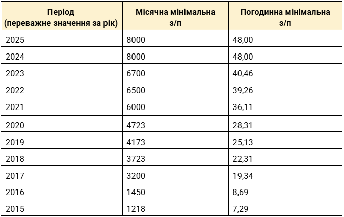 1 січня 2025 року Верховна Рада України з поданням закону про Державний бюджет визначила й розмір мінімальної зарплати — 8000 грн (48 грн за годину). Дане значення вже діє з 1 квітня 2024 року після підвищення з 7100 грн. В доларовому еквіваленті за поточним курсом НБУ мінімалка в Україні становить $190.