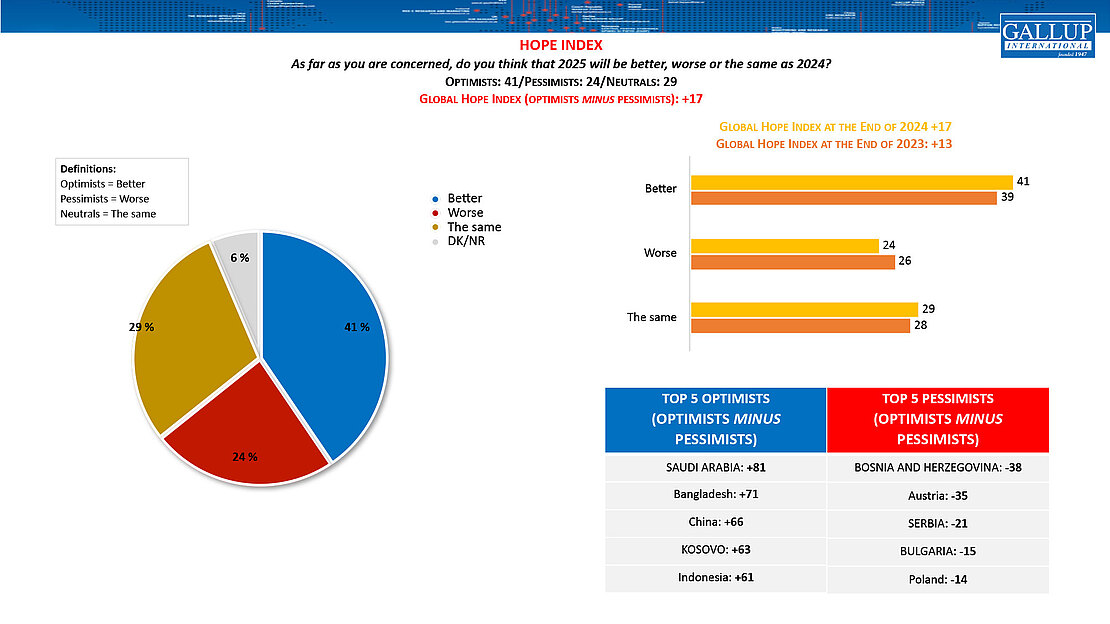 Варто зауважити, що опитування 2024 року проводилося у жовтні-грудні, коли весь світ спостерігав за фінальною битвою двох кандидатів в президенти США та наскільки вистачало фантазії жахався або, навпаки, надихався перспективами майбутнього.