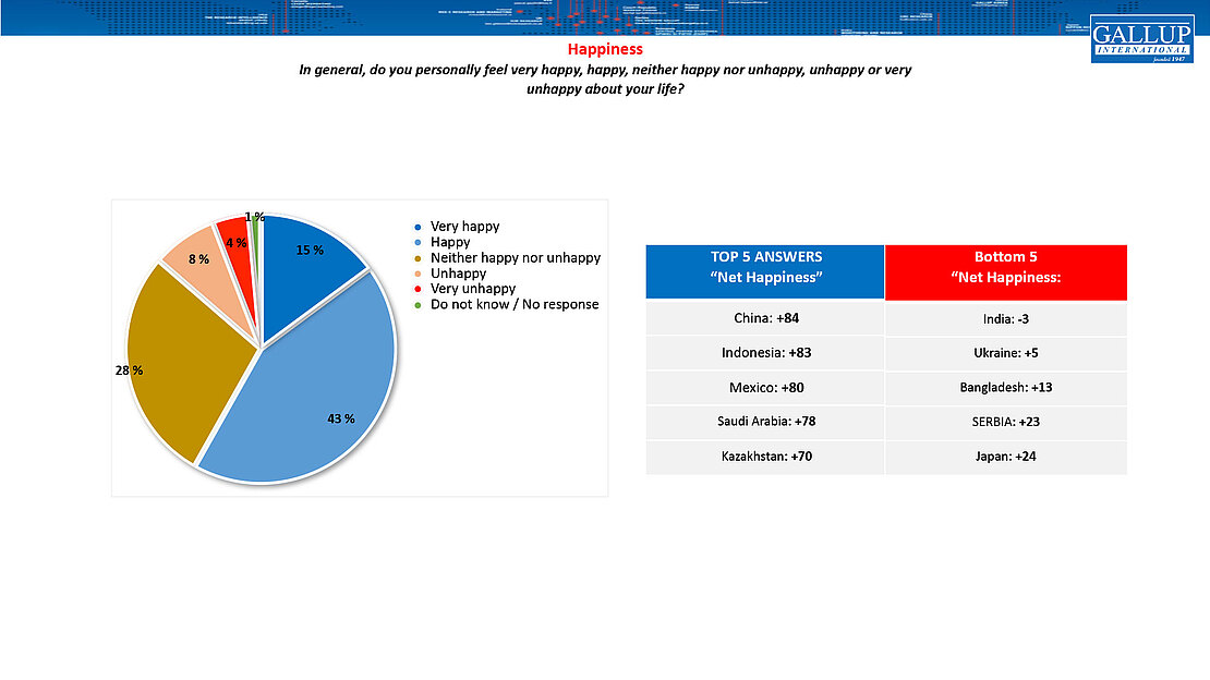 Ще гірше йдуть справи в українців у питаннях суб’єктивного відчуття щастя. Наша країна посіла другу сходинку з кінця, випередивши лише Індію. І хоча загалом щасливих людей у нас трохи більше, ніж нещасливих (саме за різницею двох показників і рахується підсумковий рейтинг), в інших країнах визнають себе щасливими набагато більше громадян. Скажімо, в КНР, яка очолила цьогорічний рейтинг, 86% опитаних відчувають себе дуже або просто щасливими.