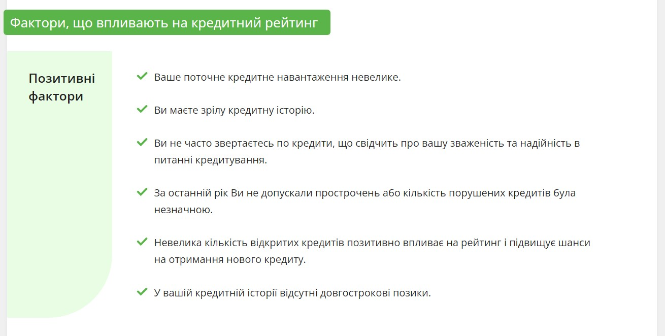 Історія твоїх вдалих кредитів, тобто таких, які ти в повній мірі і вчасно сплатив, зберігається протягом 10 років. Тож очевидно, якщо ти ніколи не брав позик або востаннє користувався кредитом дуже давно, інформації про тебе в бюро може взагалі не бути. Це також не дуже добре: більшість банків з насторогою ставляться до таких кейсів, адже не мають реальних можливостей оцінити надійних таких позичальників.