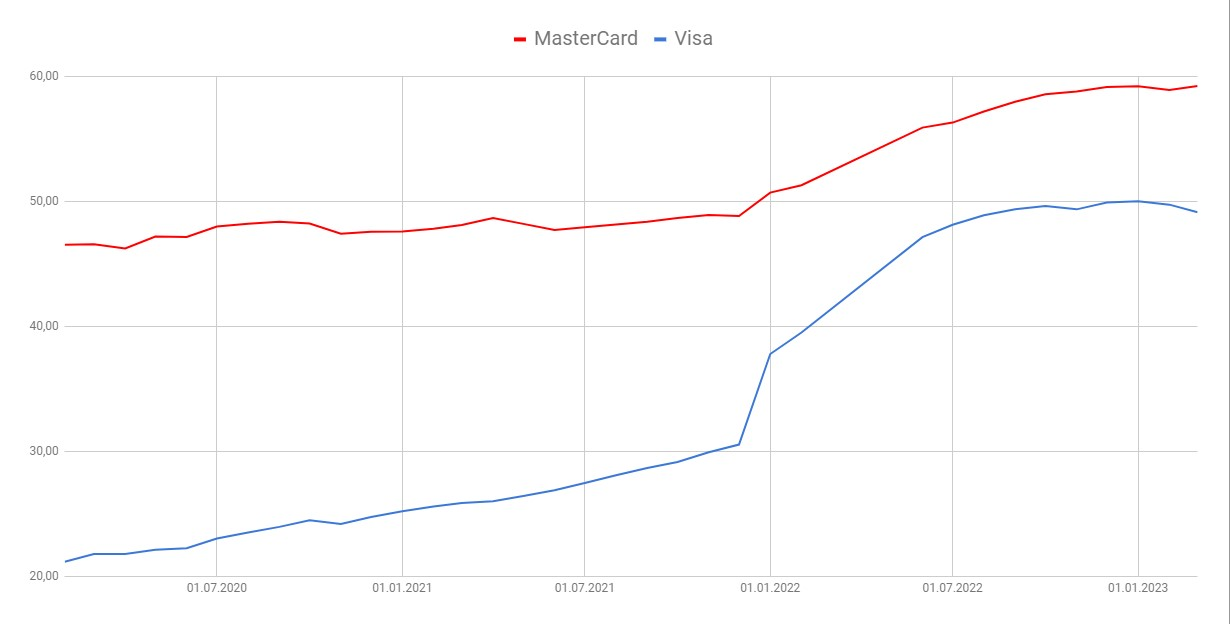 Станом на 1 березня 2023 року Mastercard була платіжною системою-лідером за кількістю емітованих в Україні карток. Помаранчево-червоний логотип був розміщений на 59 мільйонах карток, випущених українськими банками. На той же момент у Visa було 49 мільйонів карток.