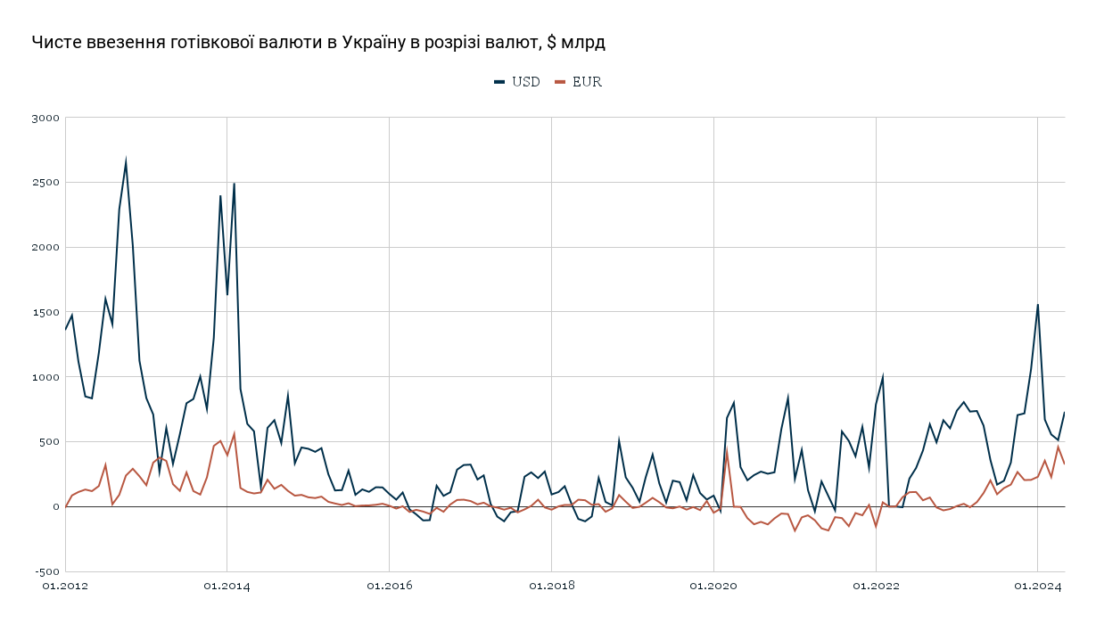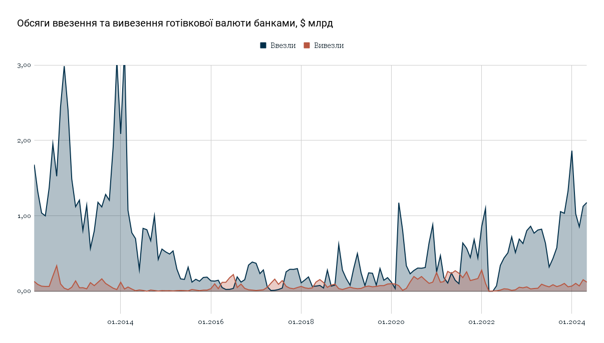 Проте, якщо дивитися на статистику, далеко не завжди українці купують валюту. Потяг до доларів та євро прокидається в них лише в кризові часи. За графіком добре видно, що пікових позначок обсяги ввезення готівкової валюти сягали в 2013-2014 роках. Сплеск фіксується у період пандемії, а також після початку повномасштабного вторгнення.