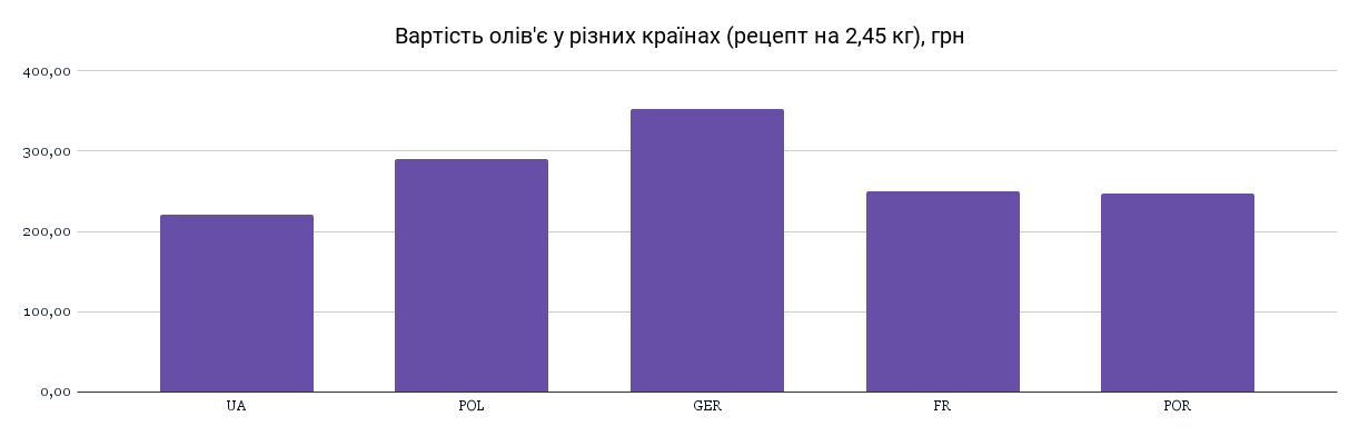 Відзначимо, що найдешевшим серед згаданих країн олів’є вийшов у Португалії. Тут за ту саму порцію салату доведеться сплатити 246,8 гривень. Запорукою успіху стали ціни на овочі, що виявилися нижчими, ніж в інших країнах. Зауваж, це лише трохи дорожче, ніж в Україні. До речі, як і в Україні, олів’є в Португалії подорожчав на 18%.