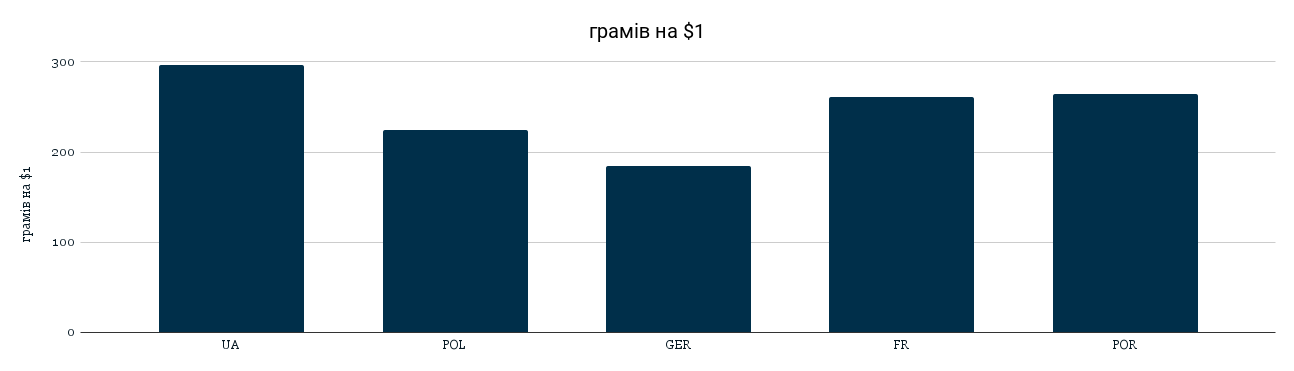На останок, ми підрахували, скільки грамів олів’є можна зробити на $1 у всіх загаданих країнах. Що з того вийшло – дивись на графіку.