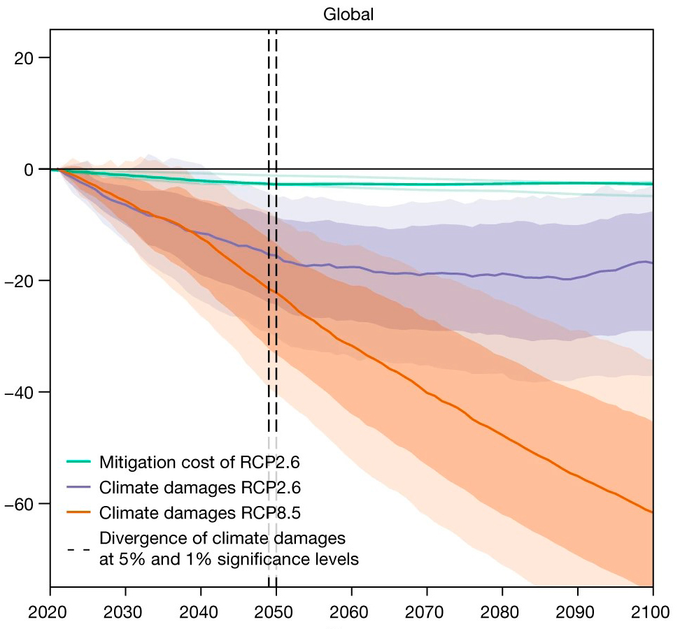 Тобі може здатися, що людству, приреченому розраховуватися за активну індустріалізацію минулих десятиліть, можна взагалі нічого не робити. Насправді це не так. Якщо дотримуватися бодай домовленостей, що містить Паризька кліматична угода, підписана країнами 2015 року, людство може стабілізувати криву подальшої шкоди і навіть дещо покращити ситуацію до 2100 року. Якщо не зробити навіть цього, показує моделювання, медіанне значення втрат доходів на душу населення досягне 60%.