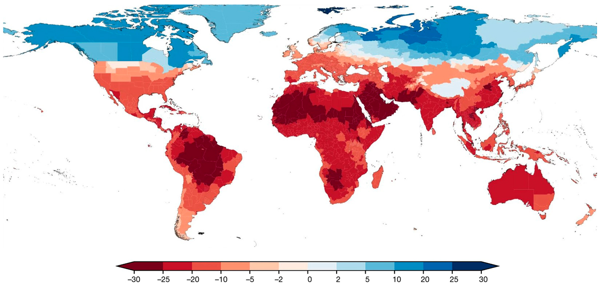 Мапа невідворотних втрат національних доходів на душу населення за регіонами планети у 2050 році у відсотках до гіпотетичного базового сценарію.