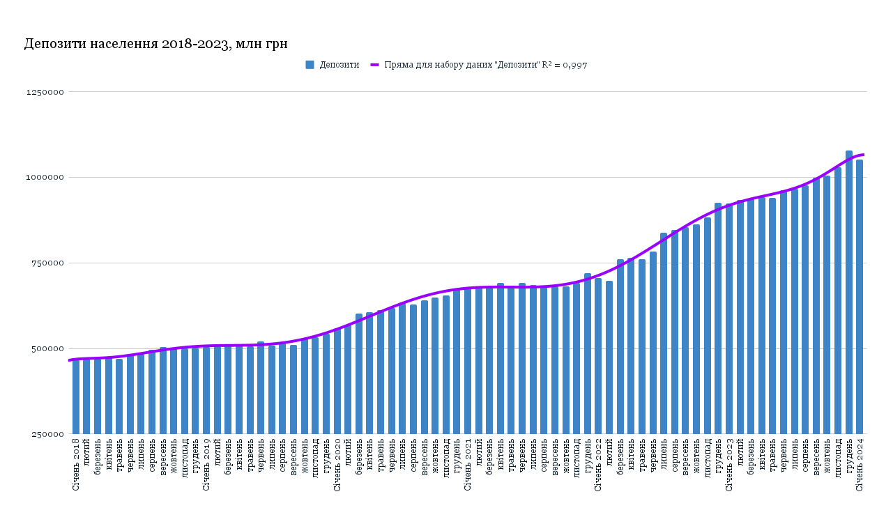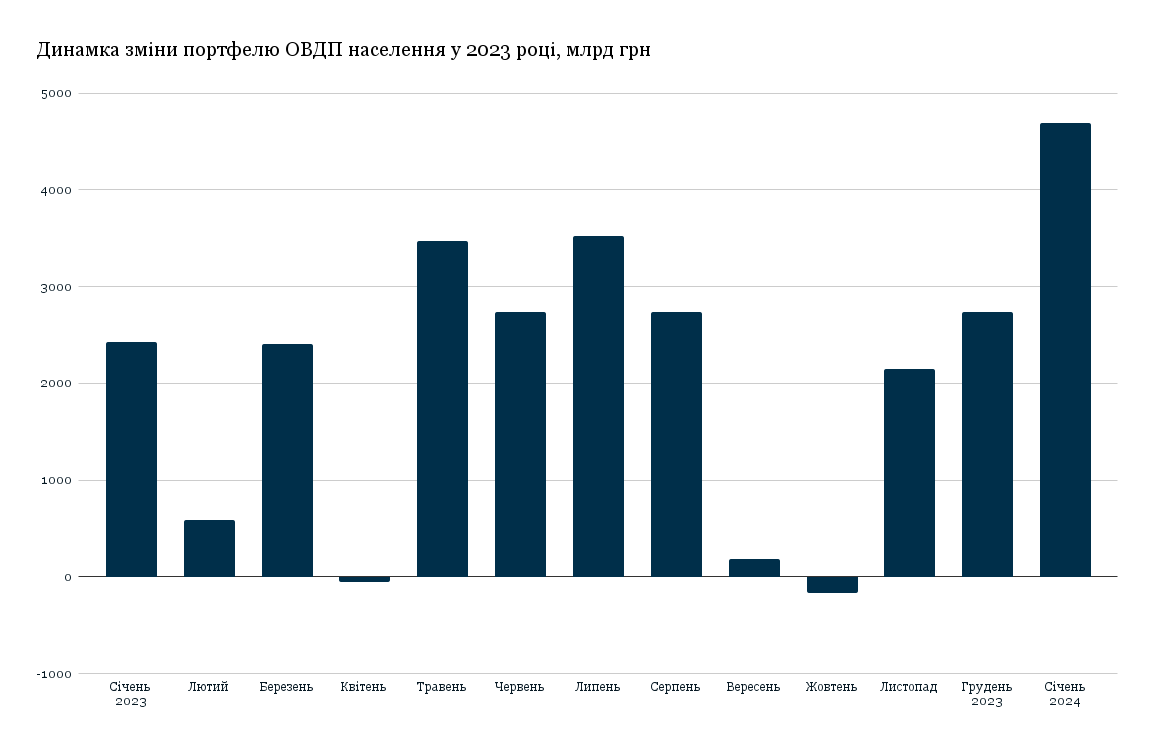 Зниження ставок за депозитами у другій половині 2023 року та посилення девальваційних очікувань змістили увагу українців з гривневих депозитів у бік купівлі іноземної валюти. За 12 місяців минулого року чиста (з вирахуванням проданої населенням валюти) купівля доларів та євро становила $5,89 млрд, що еквівалентно понад 200 млрд грн.