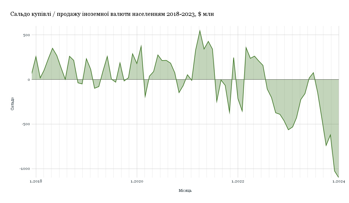 Поки, щоправда, цей сценарій частково реалізовується в частині попиту на валюту. У січні 2024 року, за попередніми даними НБУ, сума залишків на рахунках фізичних осіб в гривні зменшилася на 27,4 млрд грн. Очевидно, що дуже значна частина цих грошей потрапила на валютний ринок: за перший місяць цього року чиста купівля валюти населенням встановила багаторічний рекорд - $1,1 млрд. Катастрофи в цьому немає, принаймні якщо дивитися на цей запас валюти як на такий собі «приватні» міжнародні резерви.