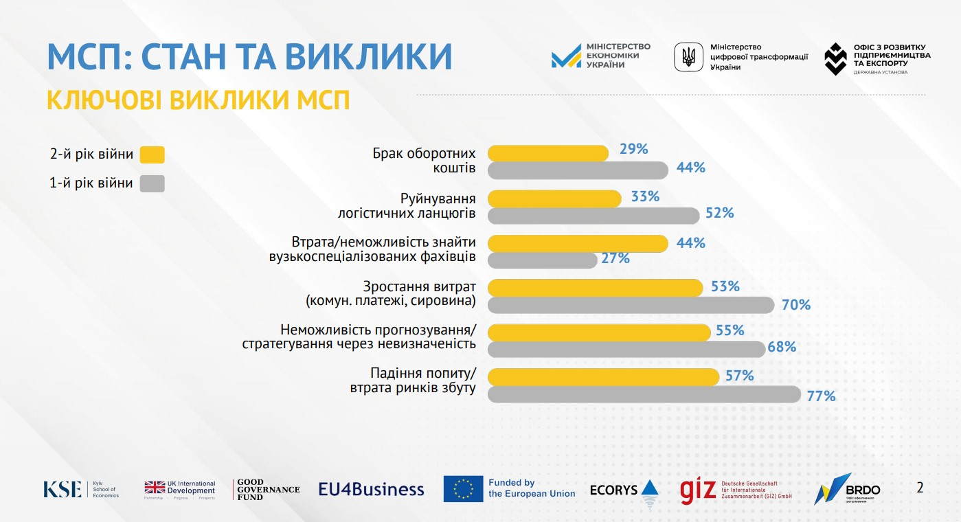 Крім того, протягом останнього року суттєво зросла кадрова проблема, яка тепер непокоїть щонайменше 44% підприємців. Серед точок болю також відзначаються брак оборотних коштів та руйнування логістичних ланцюжків. Хоча останні два пункти на другий рік війни значно втратили вагу у переліку проблем.