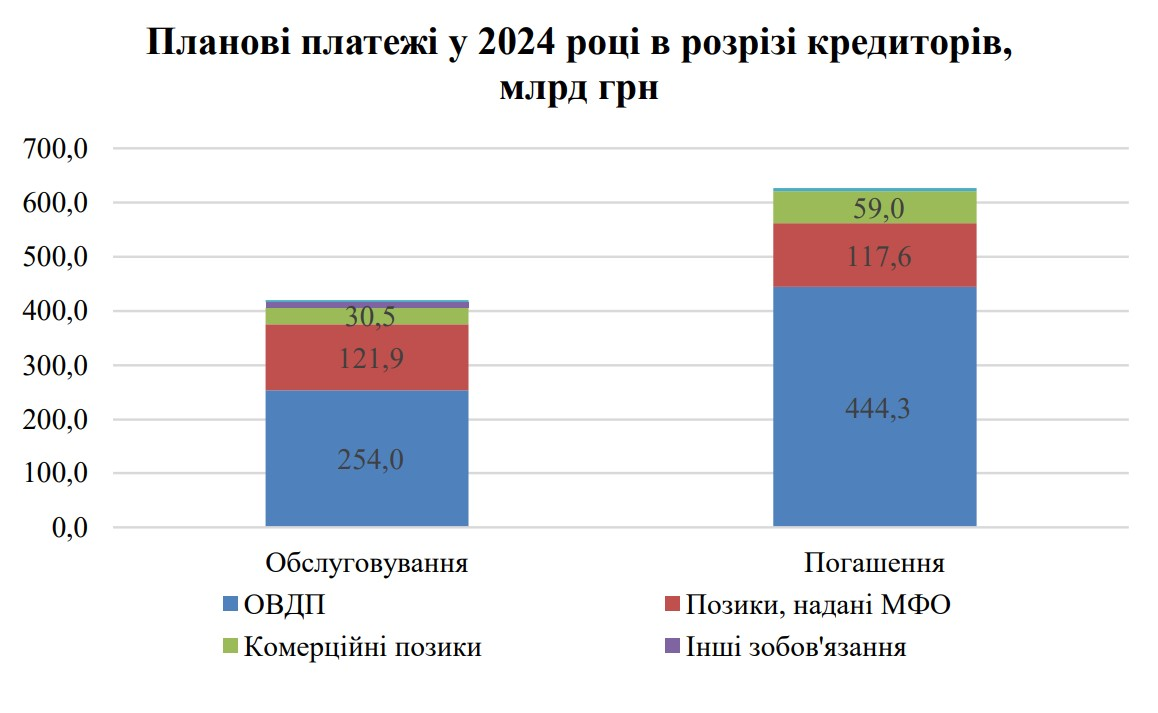 В програмі управління держборгом, затвердженій наказом Міністерства фінансів у січні 2024 року, зазначено, що протягом року лише на обслуговування боргу, тобто виплату відсотків, доведеться витратити трохи більше 400 млрд грн.