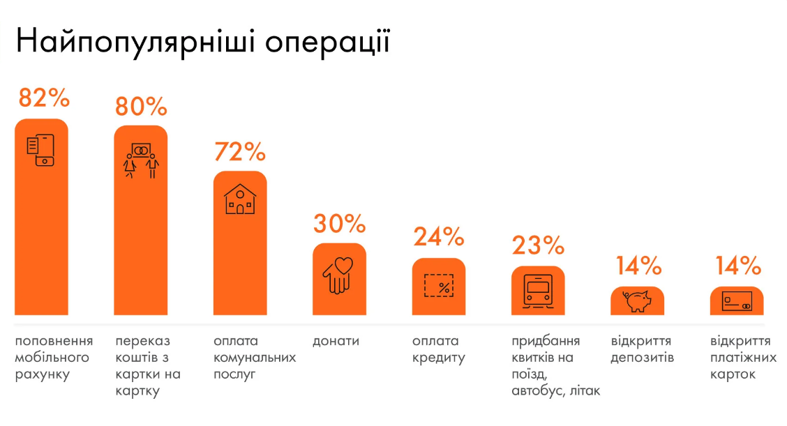 Не є чимось дивовижним і той факт, що найпопулярнішими цифровими послугами у банківських застосунках є поповнення мобільного та переказ коштів з картки на картку (82% та 80% респондентів назвали саме ці сервіси).