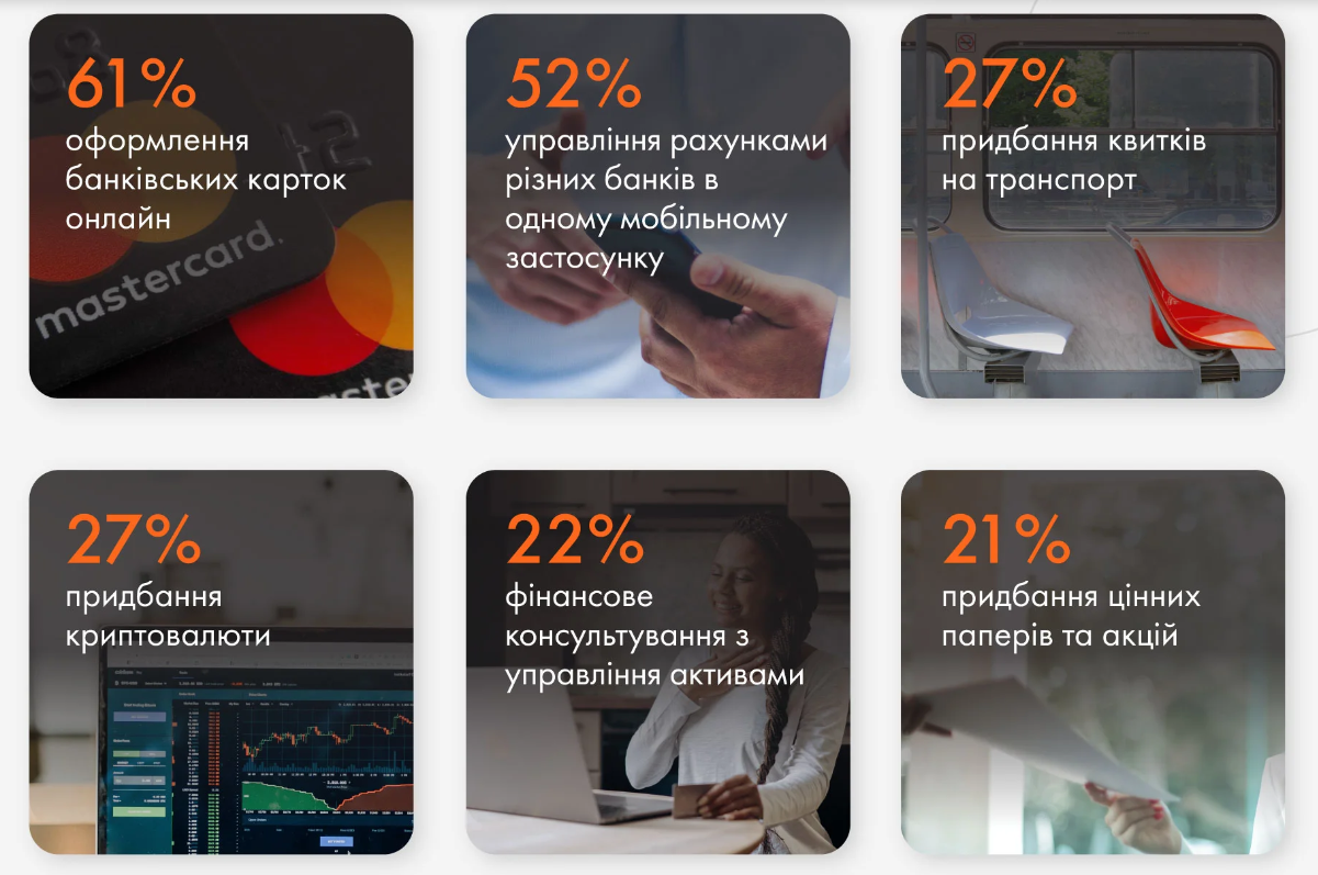 Та все ж результати дослідження скоріше надихають, ніж навпаки. Виявляється, що 21% хотіли б бачити у застосунках можливість придбання акцій та облігацій. 22% не проти отримати послугу фінансового консультування з управління активами. Та 51% опитаних хотіли б мати універсальний застосунок для керування одразу кількома рахунками та картками різних банків.