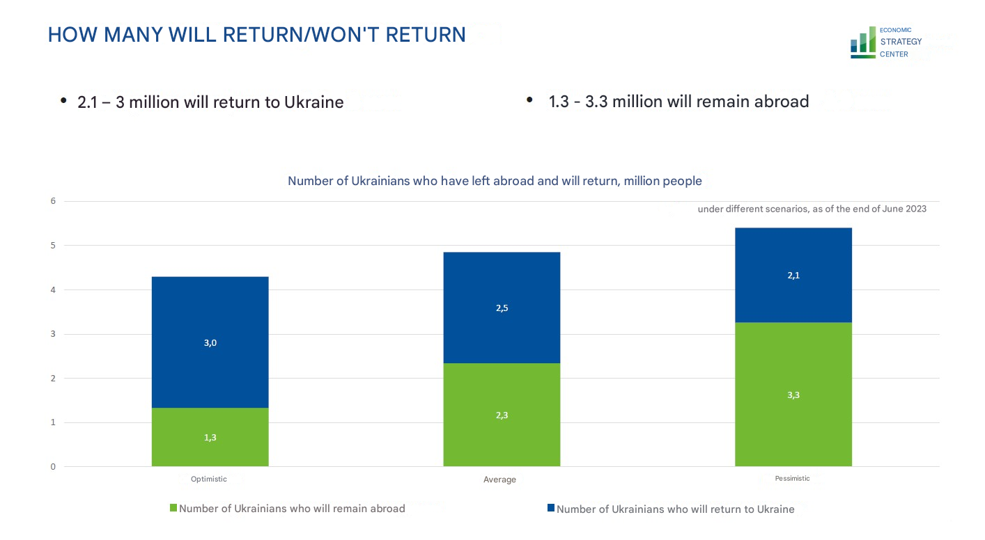According to the study, under a pessimistic scenario, out of about 6 million Ukrainian refugees, about half will not return to the country. The direct economic consequence of such a scenario is a loss of 6.9% of GDP each year. Even under an optimistic scenario, according to which only 1.3 million refugees will remain abroad, the potential GDP loss is estimated at 2.7% of GDP.