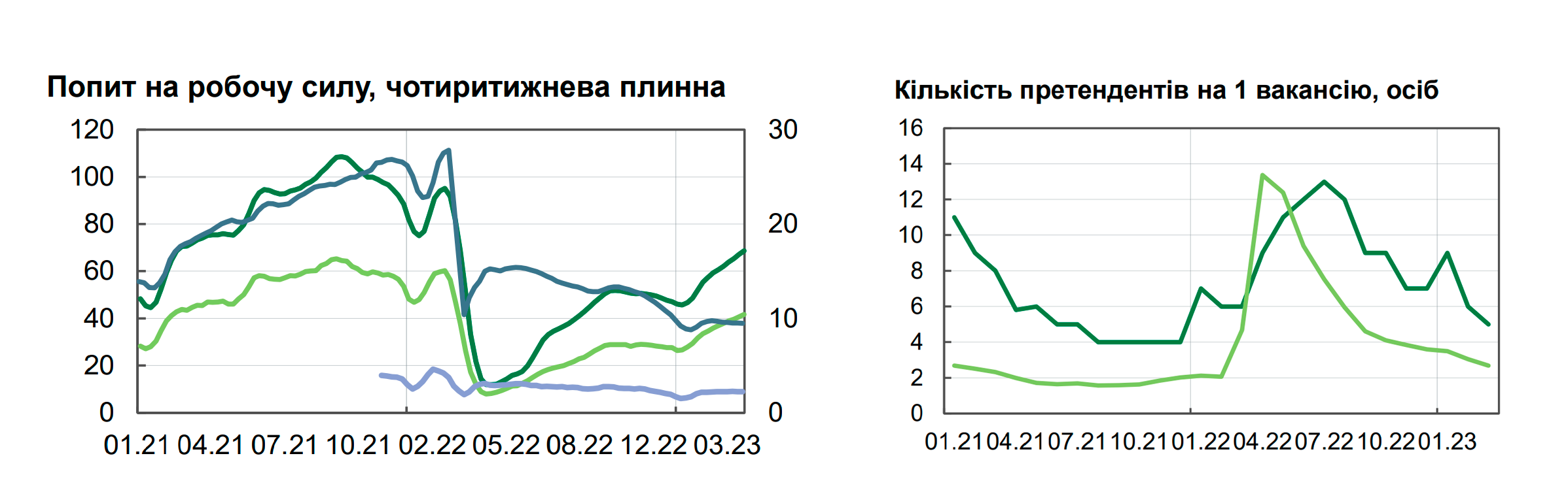 Проте усі вище згадані цифри погано корелюють із ринком праці. Так, кількість вакансій досить стрімко зростає, при цьому конкуренція за робочі місця потроху знижується. У березні на кожну вакансію припадало від 3 до 5 претендентів, що вже близько до довоєнних показників. Для порівняння, влітку минулого року показник сягав 15 претендентів на одне робоче місце.