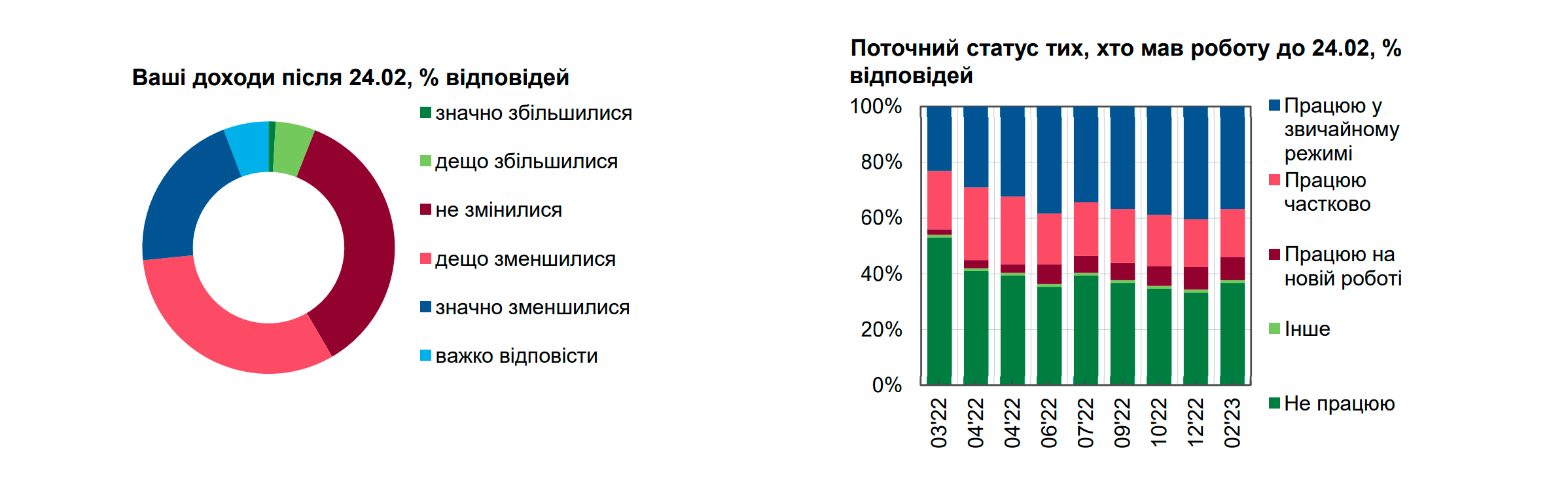 При цьому лише 6% опитаних Центром Разумкова українців повідомили про зростання зарплати від початку війни. 53% лише втратили у доходах. А більше третини (36%), які мали постійну роботу до 24 лютого 2022 року, досі знаходяться у пошуках. Найважче внутрішньо-переміщеним особам. Серед таких українців 51% залишаються безробітними, хоча до війни працювали.