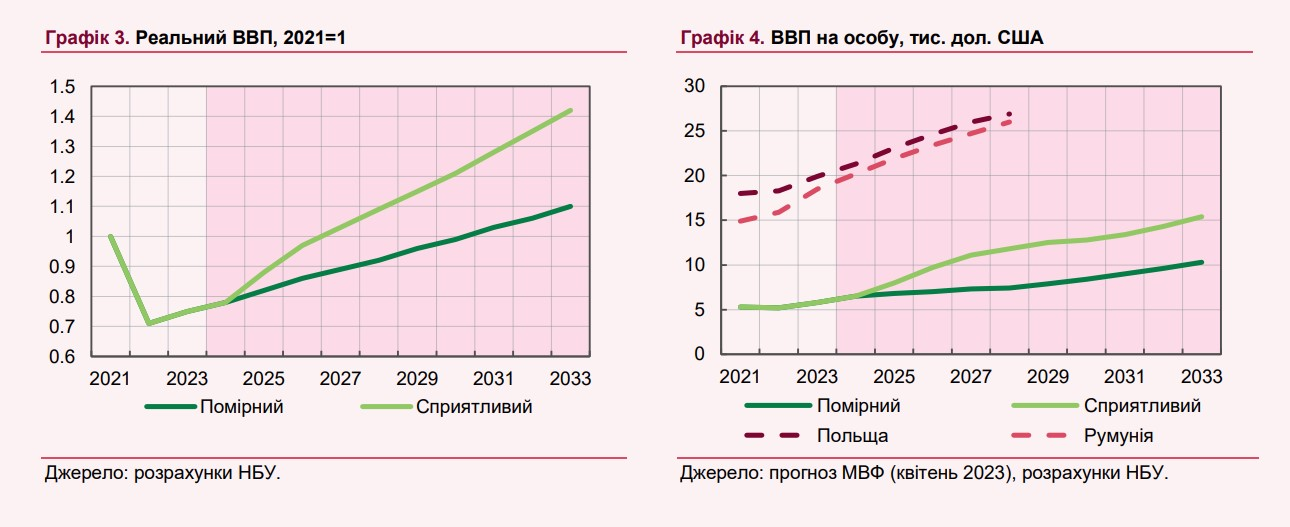 Почему эти цифры так важны? Вернемся к инфляционному отчету: «При умеренном сценарии с частичными реформами ВВП Украины на одного человека в 2033 году превысит $10 тыс. Это составляет менее 70% от уровня Румынии в 2021 году. При благоприятном сценарии эти показатели возрастут почти до $15,5 тыс. и более 100% соответственно».