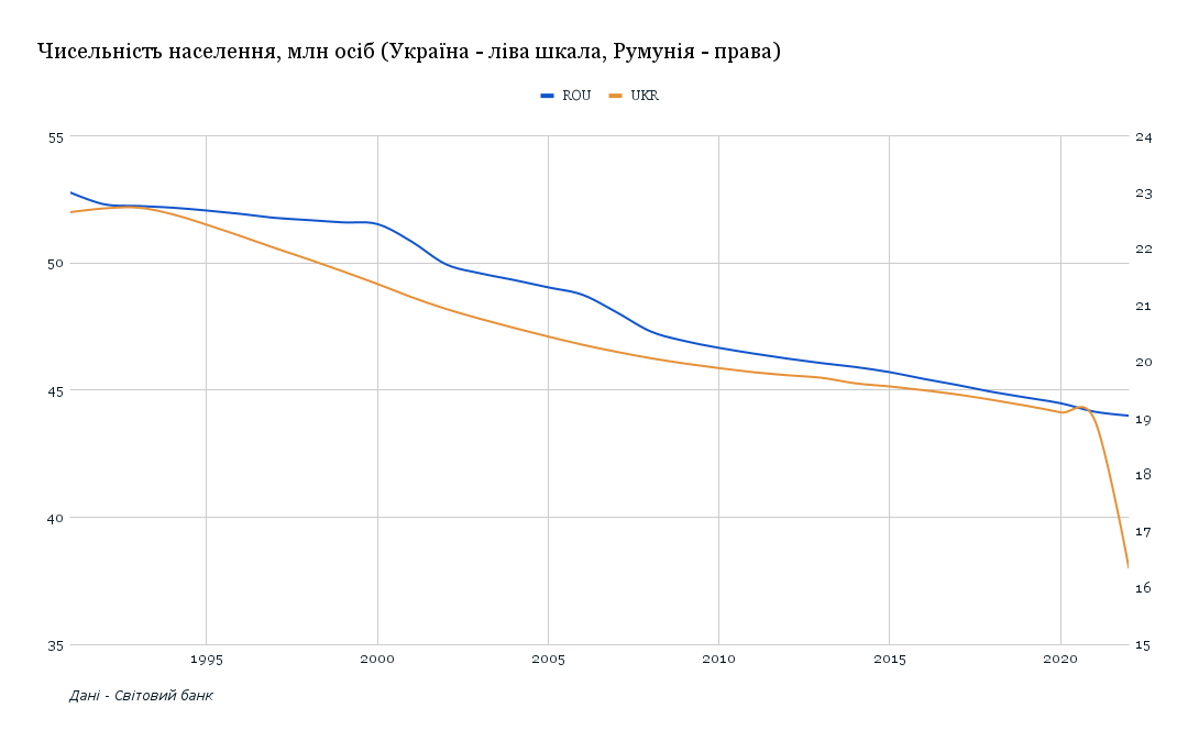 Это сравнение хоть и носит в основном «визуализационный» характер, то есть преследует цель упростить восприятие цифровых данных, на самом деле очень симптоматично. Скажем, Румыния и Украина в середине 90-х годов стартовали с примерно одинаковых показателей номинального ВВП и двигались абсолютно синхронно вплоть до 2004 года. Да и кривые численности населения двух стран идентичны. Если, конечно, не считать последние два года, когда из-за большой войны в Украине произошла масштабная депопуляция.