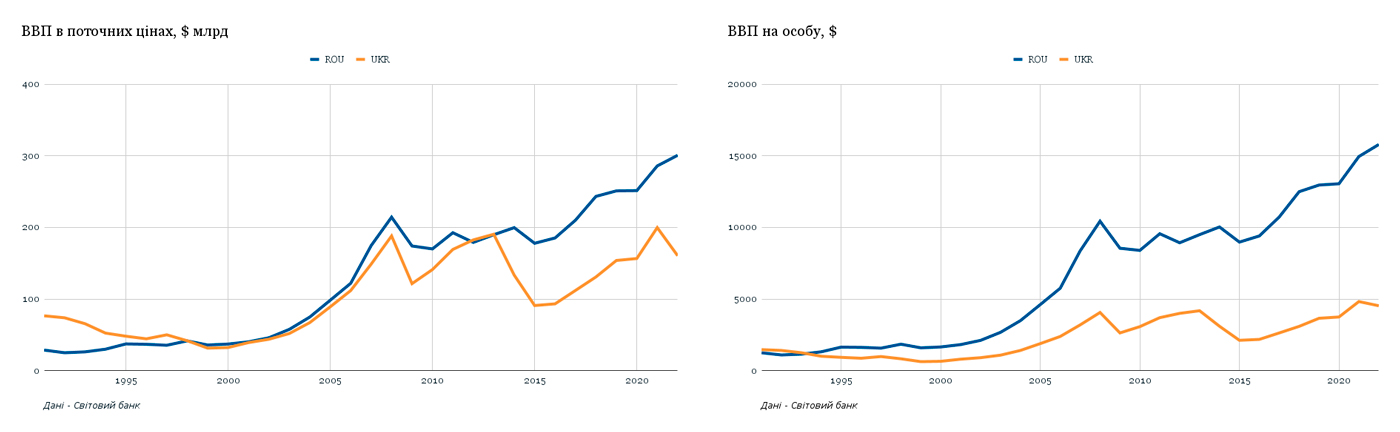 Еще менее оптимистично выглядит график ВВП двух стран в пересчете на численность населения. Отставание Украины от Румынии началось в начале 90-х и еще до серии масштабных экономических и политических кризисов достигло двукратной разницы. По итогам же 2021 года ВВП на одного человека в Румынии был втрое больше, чем в Украине.