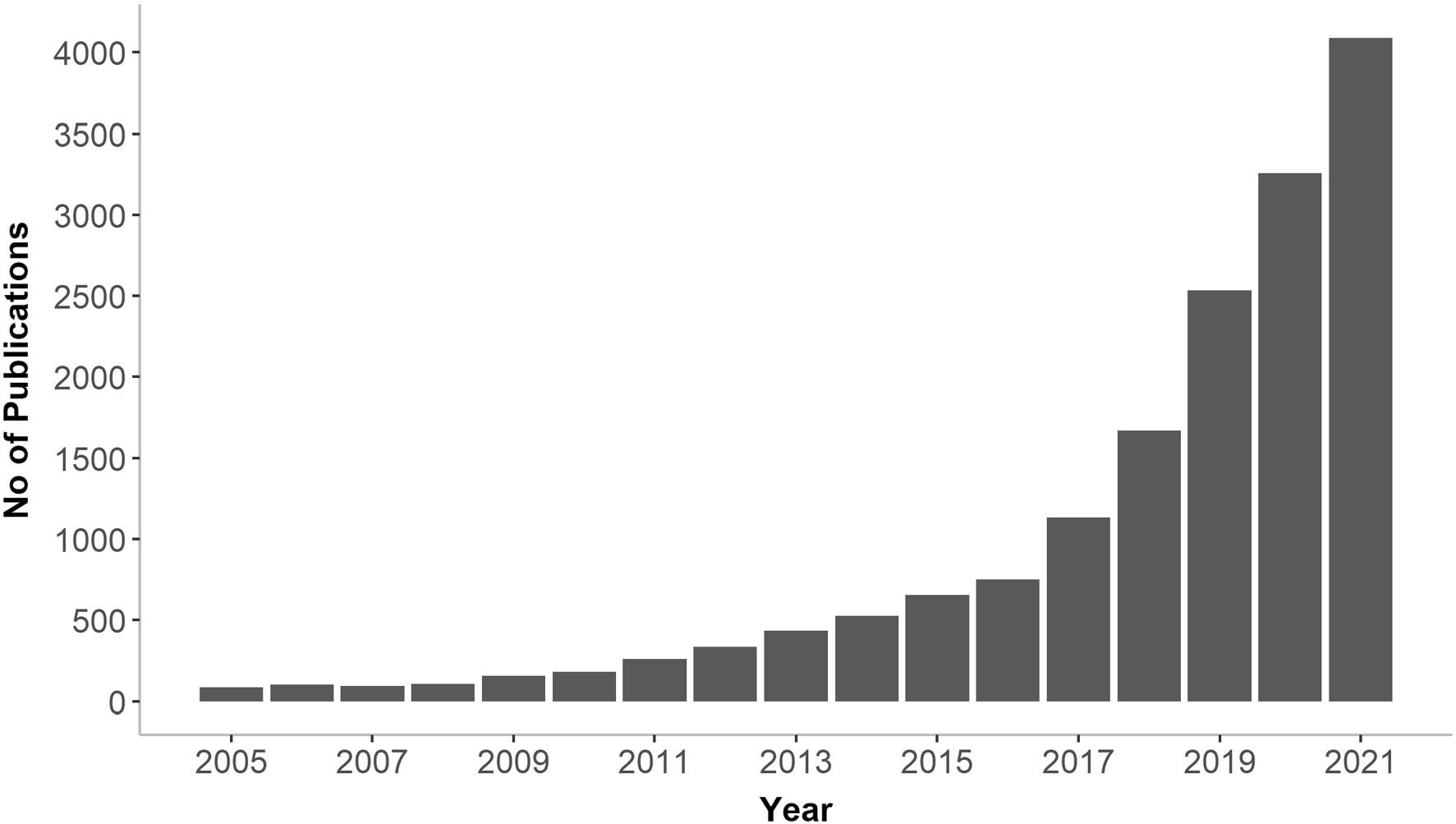 На нем изображено количество статей на упомянутую тему, которые были опубликованы в течение каждого года с 2005-го по 2021-й. Обрати внимание, речь идет именно об академических трудах, зарегистрированных в базах Scopus, Springer и EBSCO.