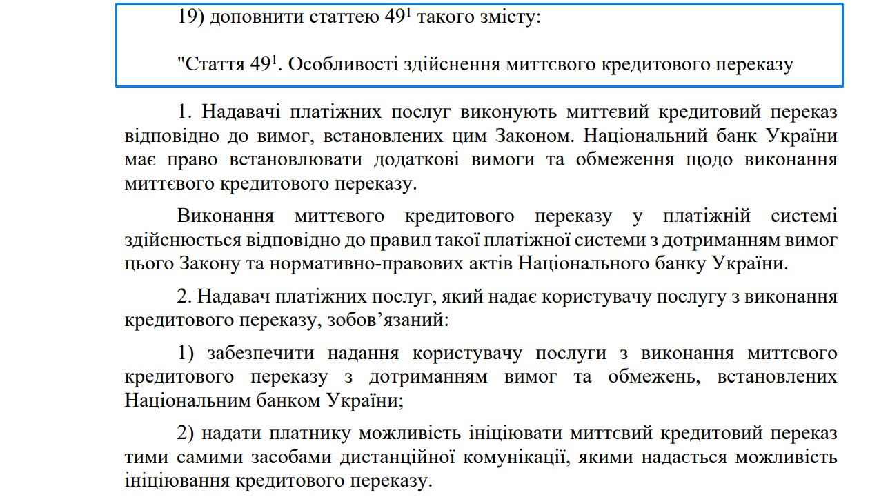Название документа по большей части и в самом деле соответствует его сути, однако есть в нем и нечто совершенно новое. В частности, уже принятая законодательная инициатива вносит в закон «О платежных услугах» новую статью 491, которая регулирует «Особенности осуществления мгновенного кредитового перевода».
