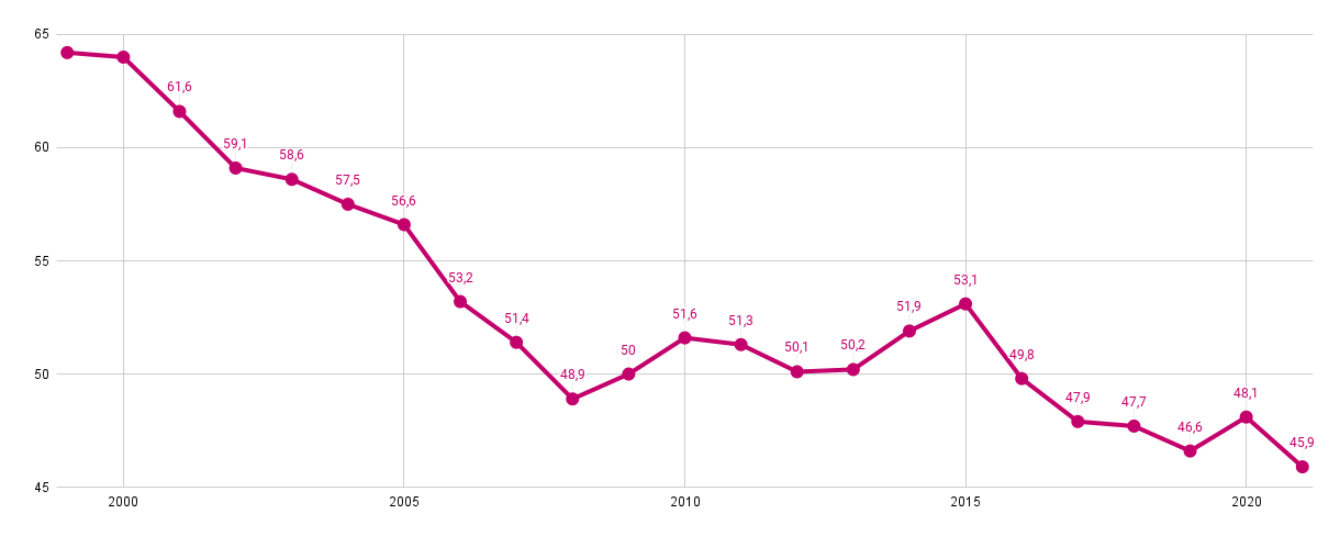 Доля доходов, которую тратили на еду украинцы на протяжение 1999-2021 годов