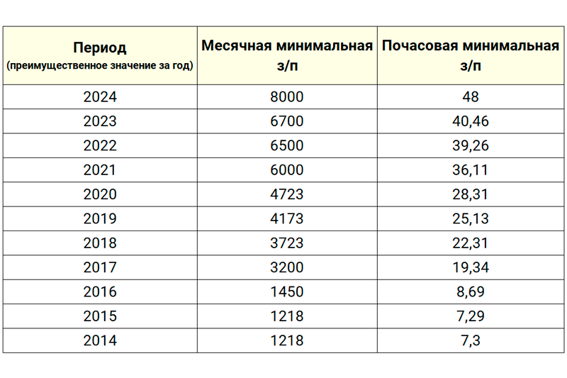 Как видно из таблицы ниже, происходит постоянное, продолжительное повышение минимальной заработной платы. Какое же влияние имеет такое изменение минималки? Давайте разберемся вместе.