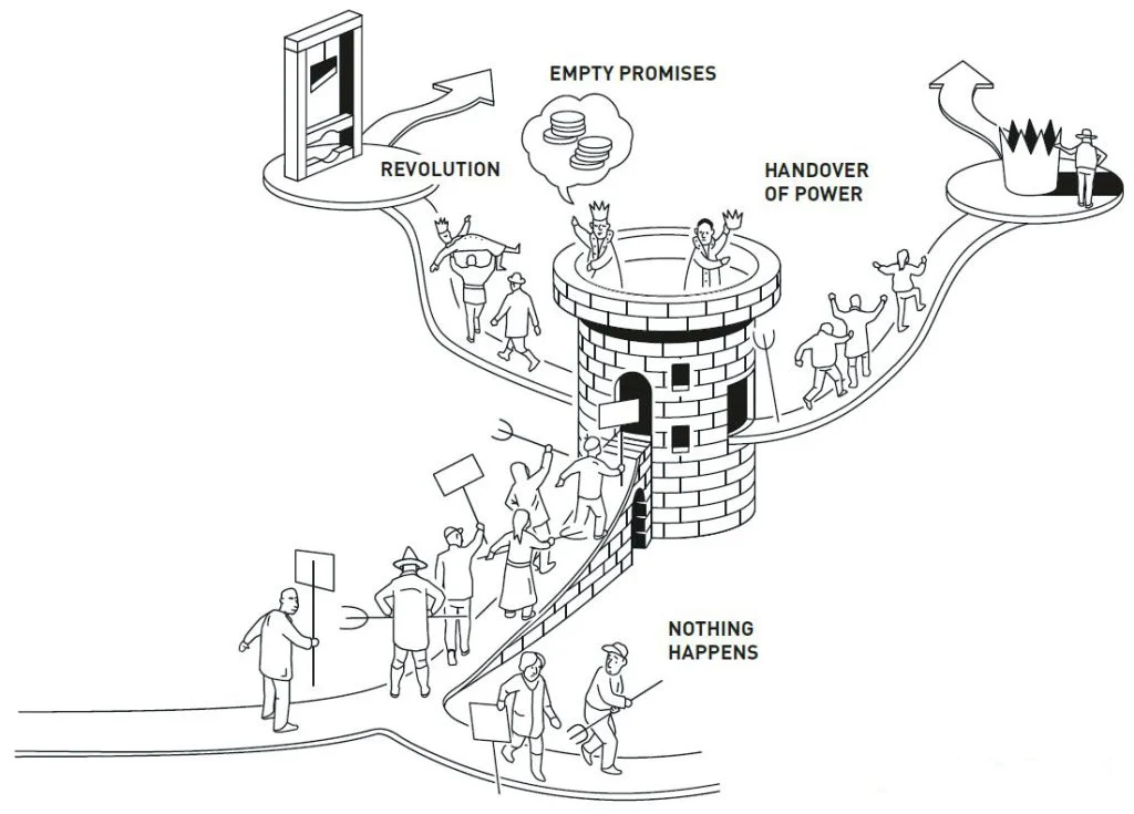 Но на практике это происходит не всегда. Потому что со временем люди разочаровываются в фактически пустых обещаниях власти, понимают, что изменения невозможны и система будет защищать существующие институты до последнего. Конечно, возможен и революционный сценарий. Таких примеров немало. Именно таким путем происходил процесс демократизации в Западной Европе в конце XIX и начале XX века. Но для этого необходимо мощное гражданское общество.