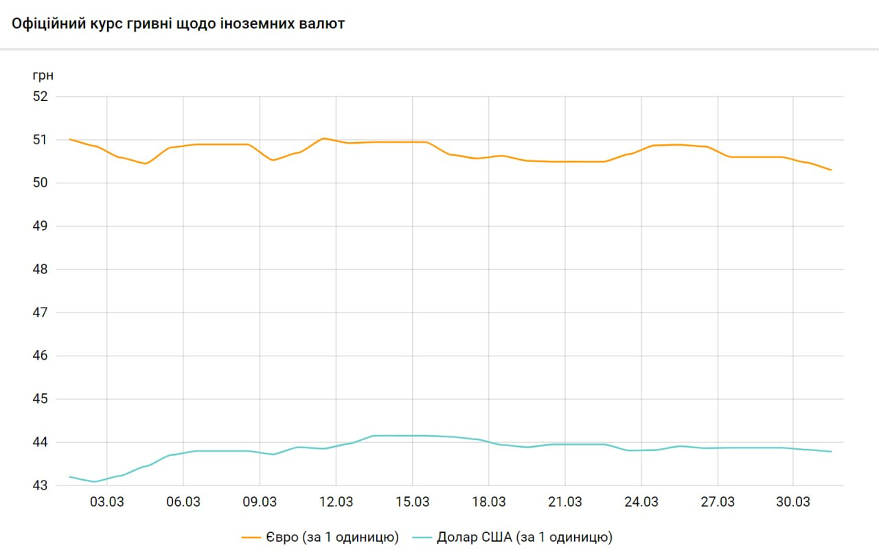 В марте валютный рынок Украины не был спокоен: курс доллара рос. Еще 2 марта официальный курс составил 43,0996 грн/долл., а уже 13 марта достиг пикового значения 44,1636 грн/долл. Всего за месяц курс обновил шесть рекордов, после чего с середины марта начал постепенно отходить от максимумов и в конце месяца стабилизировался в диапазоне 43,85–43,90 грн/долл.