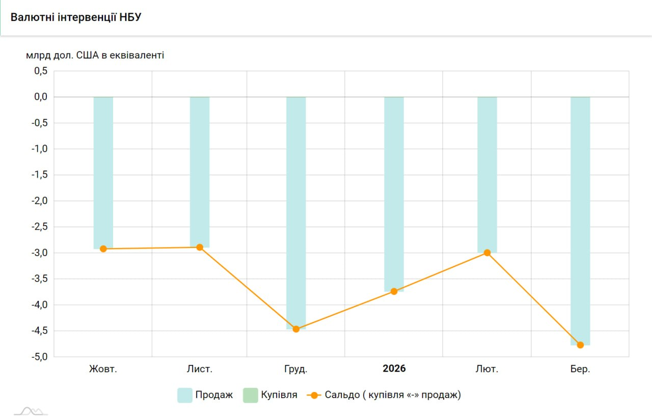 В первые дни марта курс оставался относительно стабильным, но уже 6-9 марта колебания начали расти. Нацбанк сообщил о технических трудностях с поставкой наличной валюты и приступил к специальным аукционам по обмену безналичной валюты на наличную для банков. Первые операции произошли 9 марта, а дальше НБУ продолжил регулярные продажи, в том числе 13 и 18 марта, чтобы обеспечить кассы банков и снизить спекулятивное давление. Это отчасти стабилизировало ситуацию: уже 16 марта официальный курс снизился до 44,1381 грн/долл. и дальше продолжал двигаться вниз. Совокупный объем продаж за месяц достиг рекордных 4,767 млрд долларов, а всего с начала года чистая продажа валюты НБУ превысила 11,493 млрд долларов. Благодаря этому колебания курса оставались относительно плавными: дневные изменения в большинстве своем не выходили за пределы 50-70 копеек. На наличном рынке банки также удерживали относительно стабильные котировки и доллар в среднем находился в диапазоне 43,65–44,15 гривны.