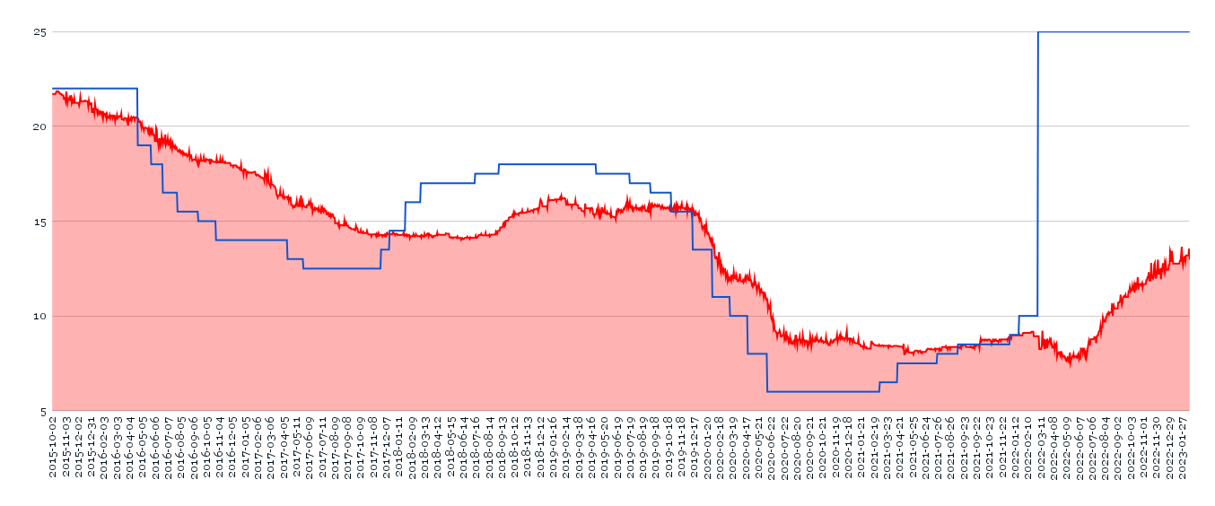 Следовательно, прежде всего учетная ставка имеет целью удерживать темпы роста потребительских цен. Но, учитывая инерционность процесса переноса ставки на финансовые рынки, центральный банк интересует не только сама инфляция, но и инфляционные ожидания. Ведь они очень сильно влияют на потребительское поведение и могут привести к ускорению или замедлению инфляции.