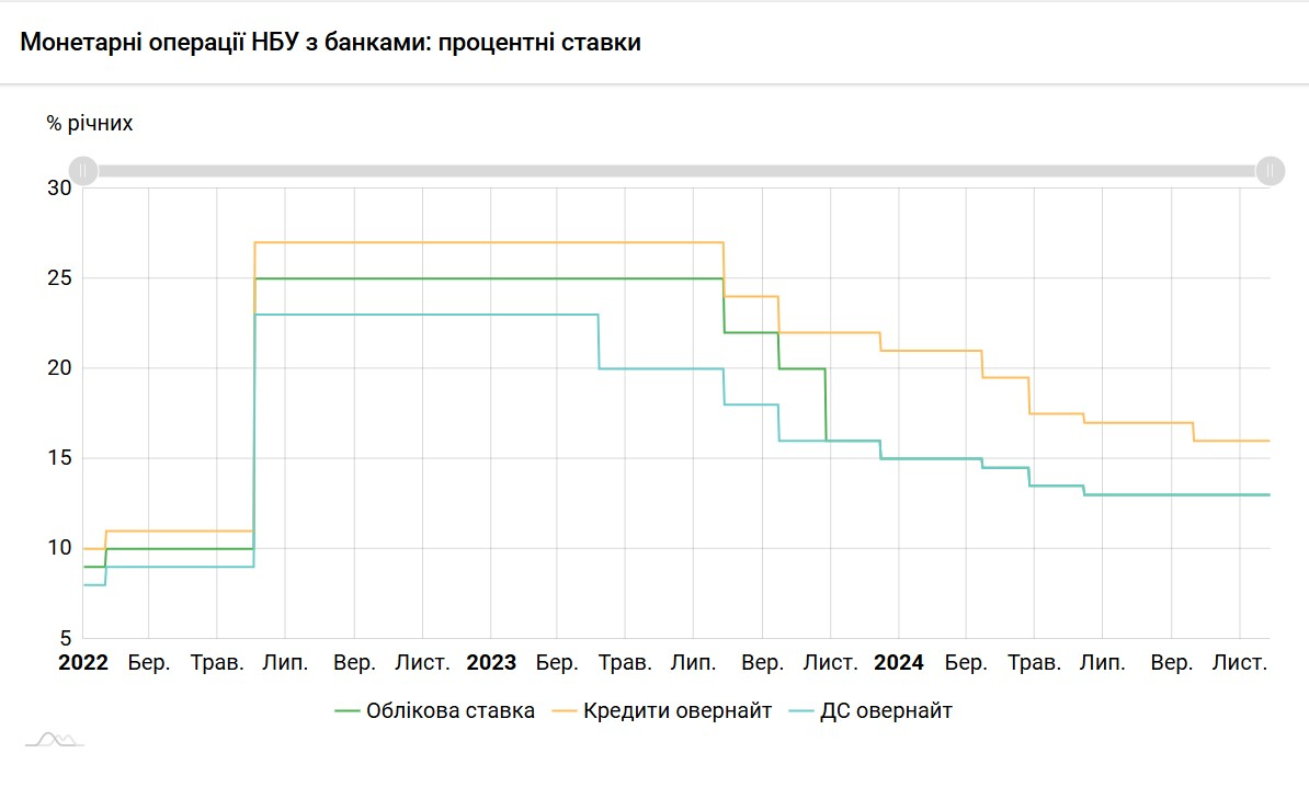 В начале полномасштабного вторжения Национальный банк принял ряд решений, которые можно назвать шоковой терапией. В частности, в несколько раз, до 25% годовых повысил учетную ставку. С тех пор, по мере улучшения ситуации в экономике и замедления инфляции, ставка была снижена в несколько этапов. Важно понимать, что не существует никаких формул, как определяется учетная ставка НБУ. Расчет достаточно условен, обсуждается коллегиальным органом с учетом текущих и прогнозных экономических данных. А потом уже принимается окончательное решение.