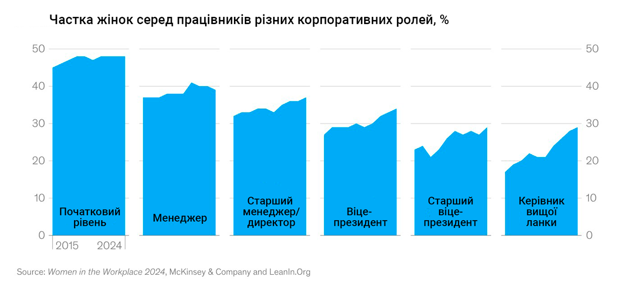 Скажем, доля женщин среди заместителей высшего руководящего звена выросла с 23% в 2015 году до 29% в 2024 году. Наилучшие же показатели в абсолютных цифрах фиксировались на начальном карьерном уровне. Здесь доля женщин выросла с 45% до 48%.
