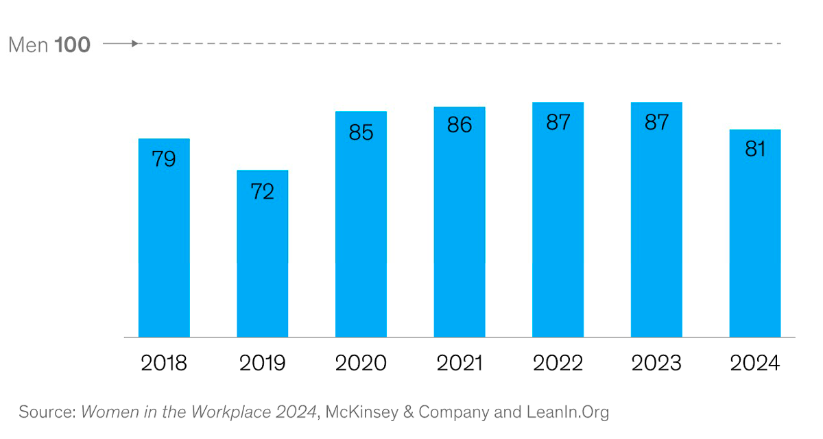 В 2018 году на каждые 100 повышений мужчин до уровня менеджера фиксировалось всего 79 аналогичных случаев для женщин. К 2023 году цифра выросла до оптимистических 87%. Однако в текущем году аналитики зафиксировали резкое сокращение показателя до 81%. То есть фактически до значений, фиксировавшихся в начале регулярного исследования этого вопроса.
