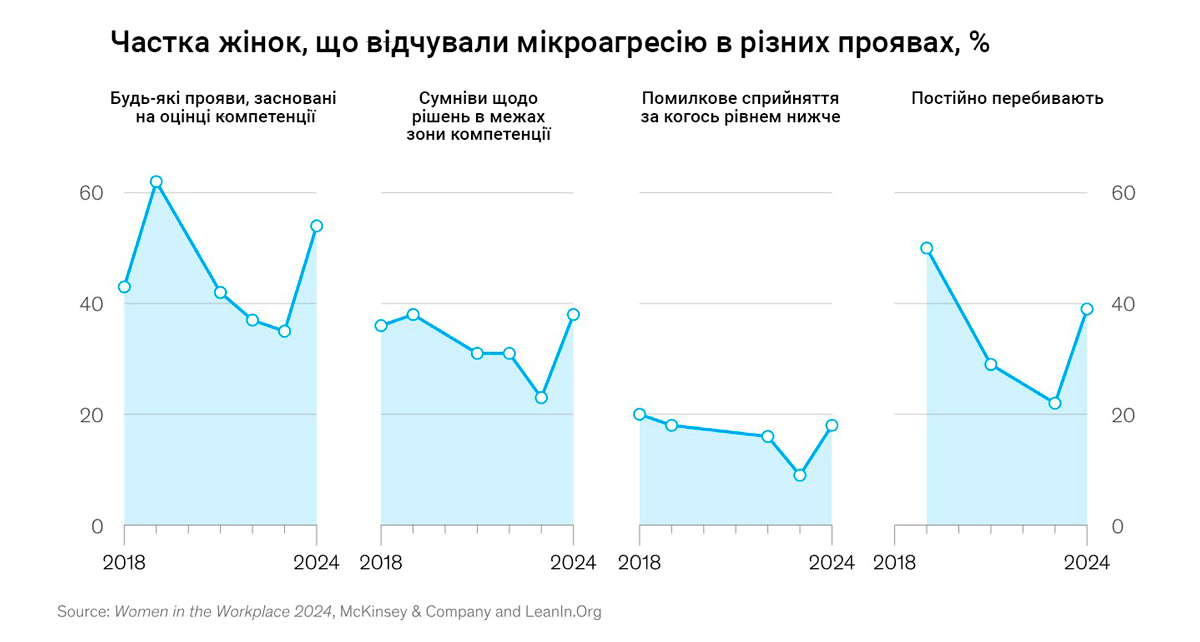 Худшие показатели среди различных составляющих микроагрессии демонстрировали любые проявления относительно компетентности работниц. С такими прецедентами сталкиваются 50% женщин из тех, кто в принципе фиксировал проявления микроагрессии. Самые низкие показатели в категории ошибочного восприятия работниц как кого-то уровнем ниже. Но даже что касается банального перебивания при общении цифры достигают 40%.