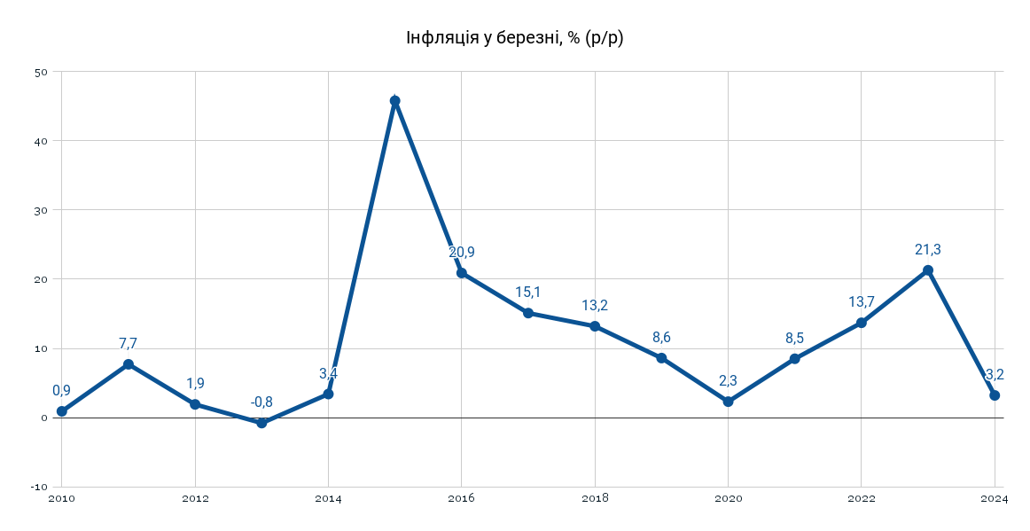 За підсумками березня споживча інфляція в Україні у річному вимірі (відносно березня 2023) уповільнилася до 3,2%. Це суттєво нижче очікувань НБУ та вже за межами цільового коридору регулятора, нижня межа якого становить 4%.