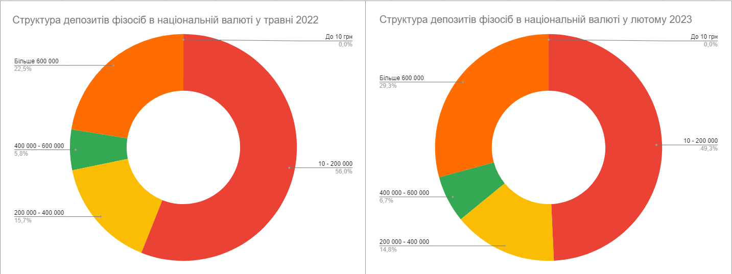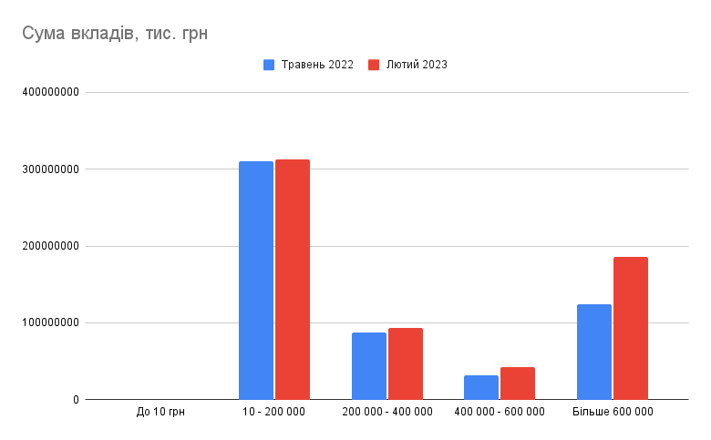 У травні 2022 року в банківській системі налічувалося 72 115 депозитів на понад 600 тисяч гривень. Й на кожному з них в середньому зберігалося 1 мільйон 726 тисяч гривень.